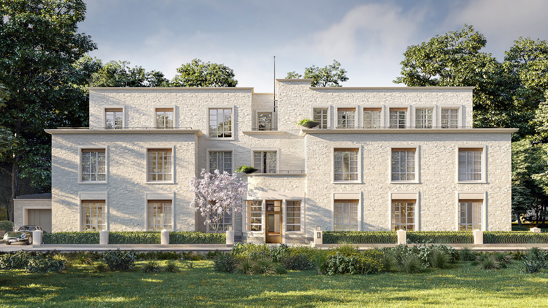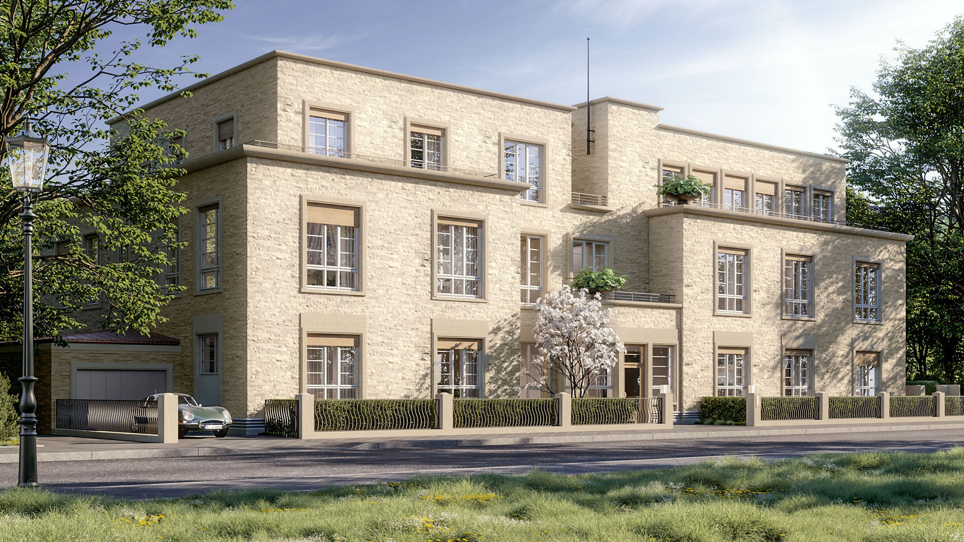 Das Gebäude mit seinen nur fünf Wohnungen – eine davon das krönende Penthouse – zeichnet sich durch seine zeitlose Architektur und seine souveräne Eleganz aus. Die durch hohe, schlanke Fenster, ausladende Terrassen und Wintergärten strukturierte Fassade wird zusätzlich mit kostbarem, handbehauenem Naturstein veredelt. An der Parkseite entstehen zwei große, helle Sonnenhöfe. Hier verbindet sich der Neubau mit dem denkmalgeschützten Park zu einer vollkommenen Einheit. Und es wirkt fast so, als hätte die Stadtvilla hier schon zu Zeiten der Henkels an dieser Stelle gestanden.