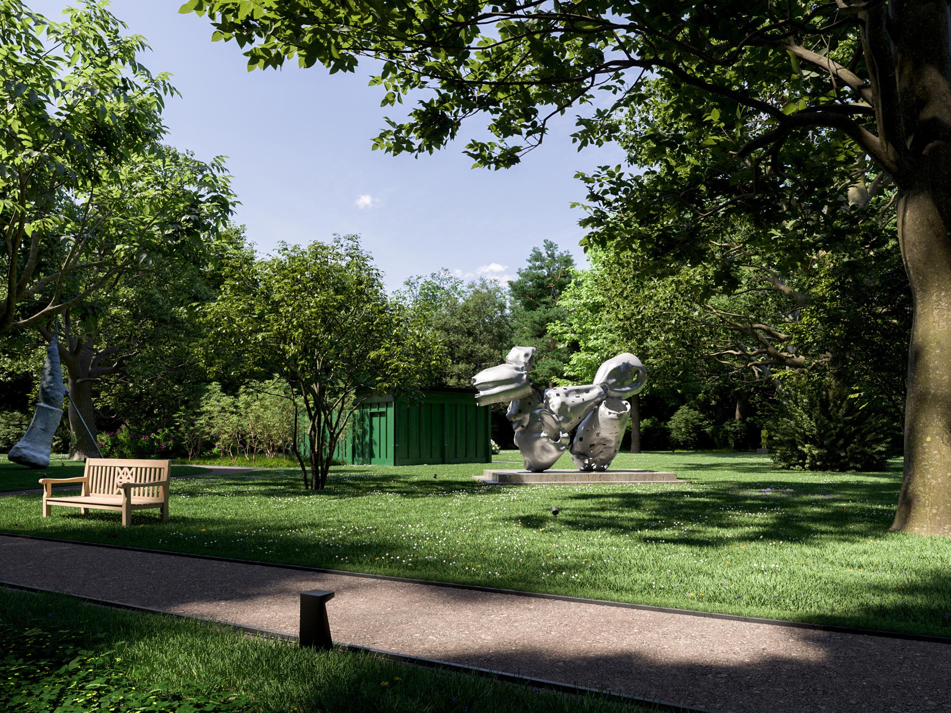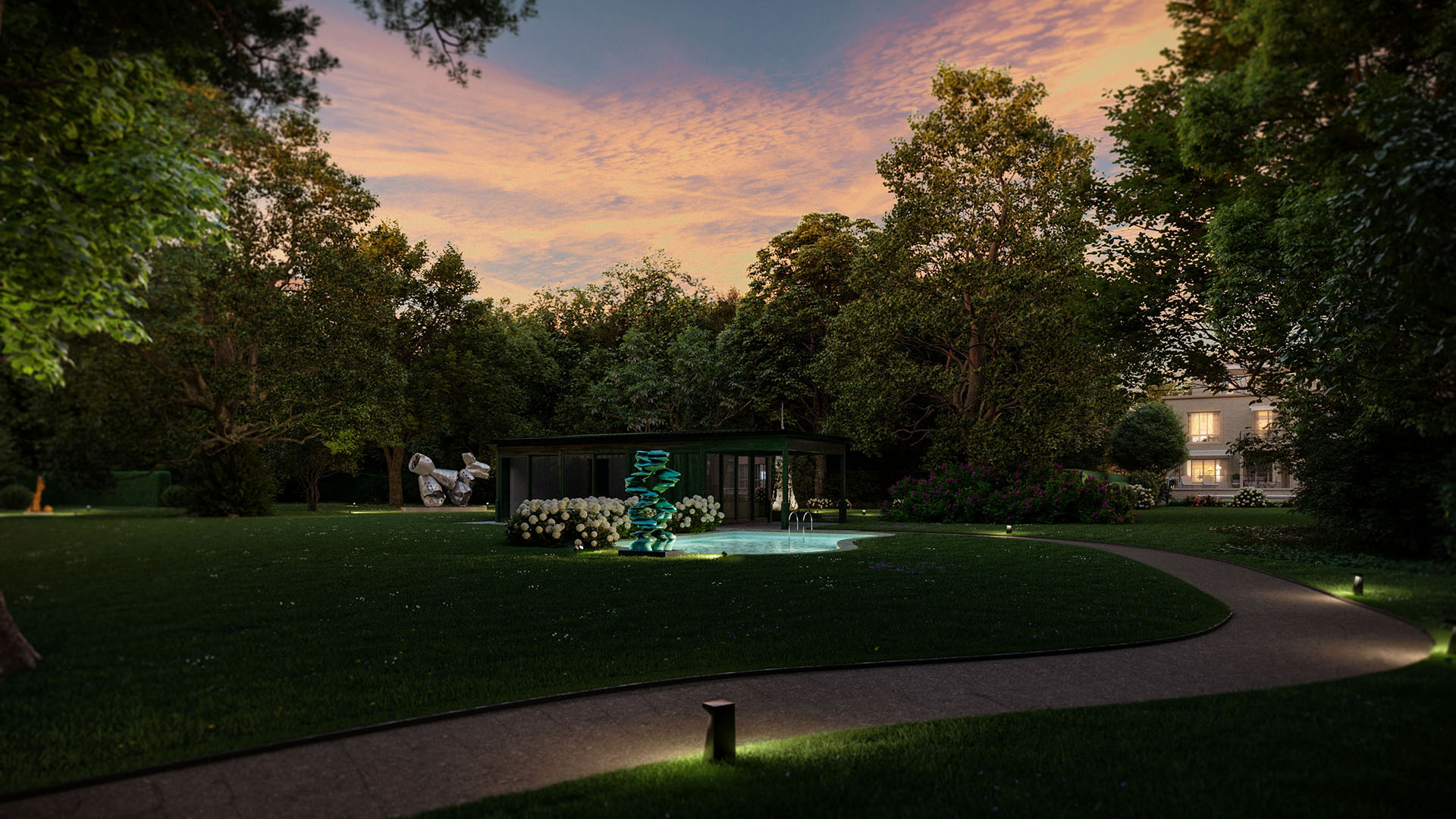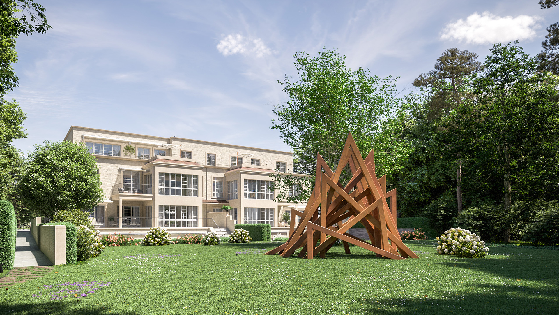Wer in einer der nur fünf Residenzen von CHAMI 9 lebt, muss diesen Kompromiss nicht eingehen. Sie haben zwar das Privileg, den weitläufigen, mit der Stadtvilla verbundenen, einmaligen Skulpturenpark zu nutzen. Die professionelle Pflege von Park und Pool sowie die Organisation der Kunstwerke aber übernimmt die Familie Schmitz als Betreiber.