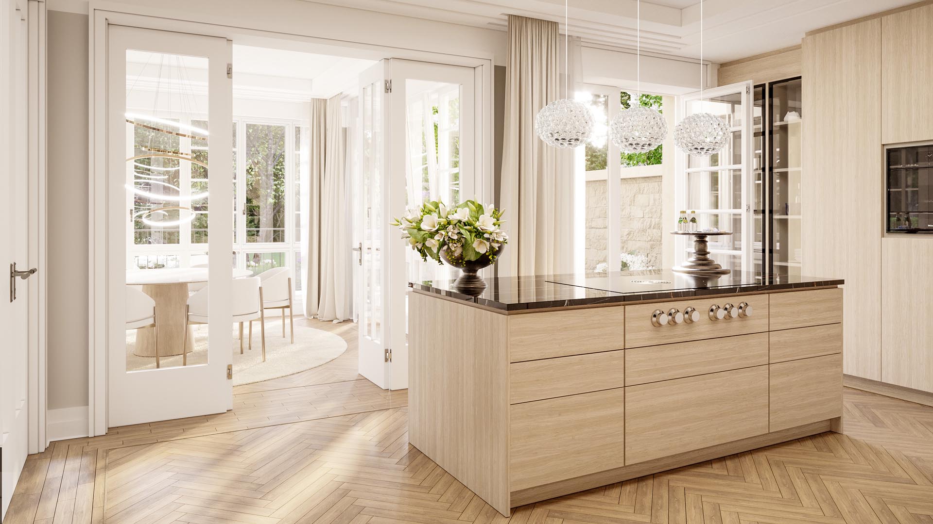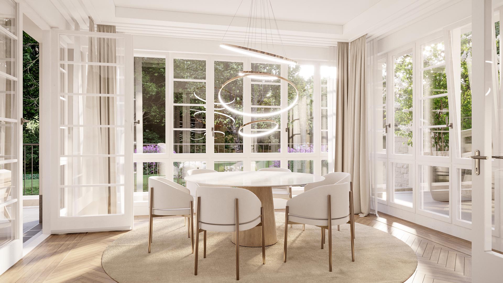 Die fünf Residenzen von CHAMI 9 stehen für einen zurückhaltend-luxuriösen Wohnstil, der auf Großzügigkeit, Licht und klare Linien setzt. Offene Grundrisse, raumhohe Fenster und fließende Übergänge zwischen Wohn-, Ess- und Außenbereichen schaffen eine Atmosphäre von Weite und Leichtigkeit.