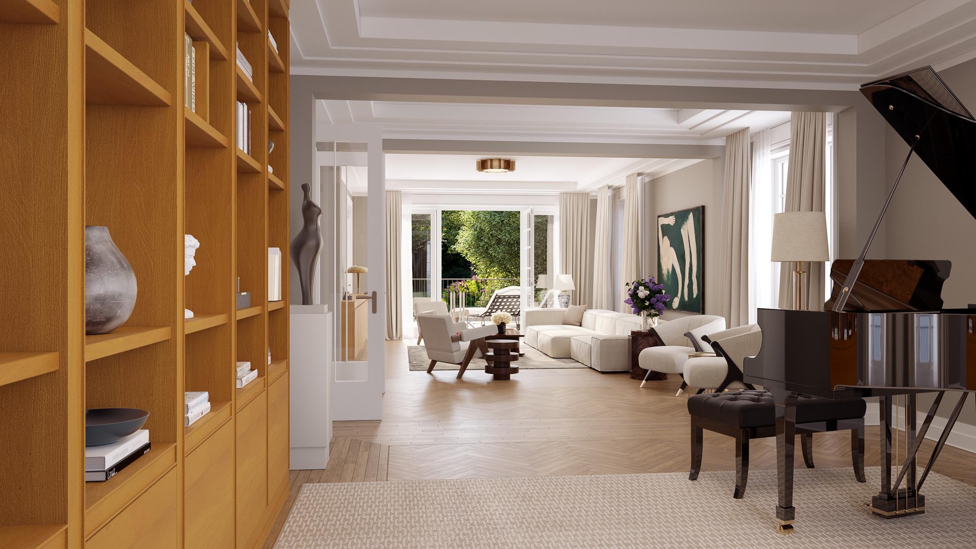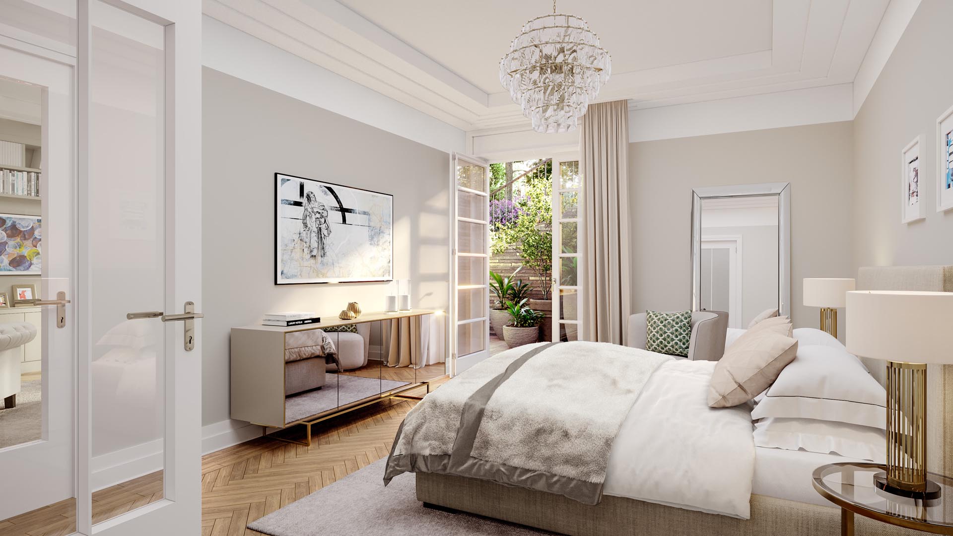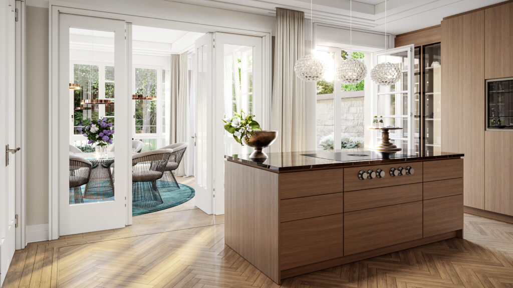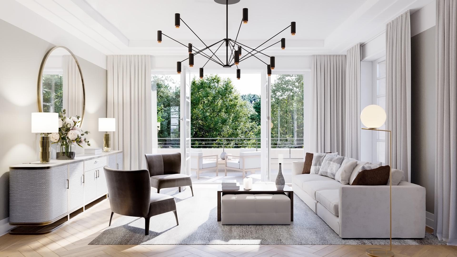 Residence N° 4 ist ein Refugium von zeitloser Eleganz, ein Ort, der die Seele ebenso anspricht wie den Verstand. Gelegen im ersten Obergeschoss, öffnet diese Wohnung ihre großzügigen Räume zu einem Lichtspiel aus Fenstern und Balkonen, das den Blick auf den New Sculpture Park mit seinem altehrwürdigen Baumbestand freigibt.