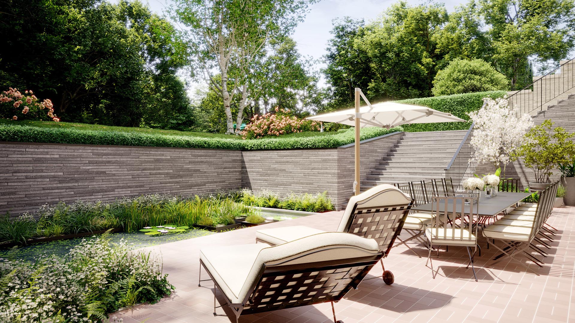 Die Residence N° 3, im ersten Obergeschoss gelegen, ist ein Raum, der Geschichten flüstert und neue schreiben möchte. Mit einer weitläufigen Terrasse und einem lichtdurchfluteten Wintergarten öffnet sie den Blick auf den New Sculpture Park, dessen 150-jähriger Baumbestand die Zeit überdauert hat.